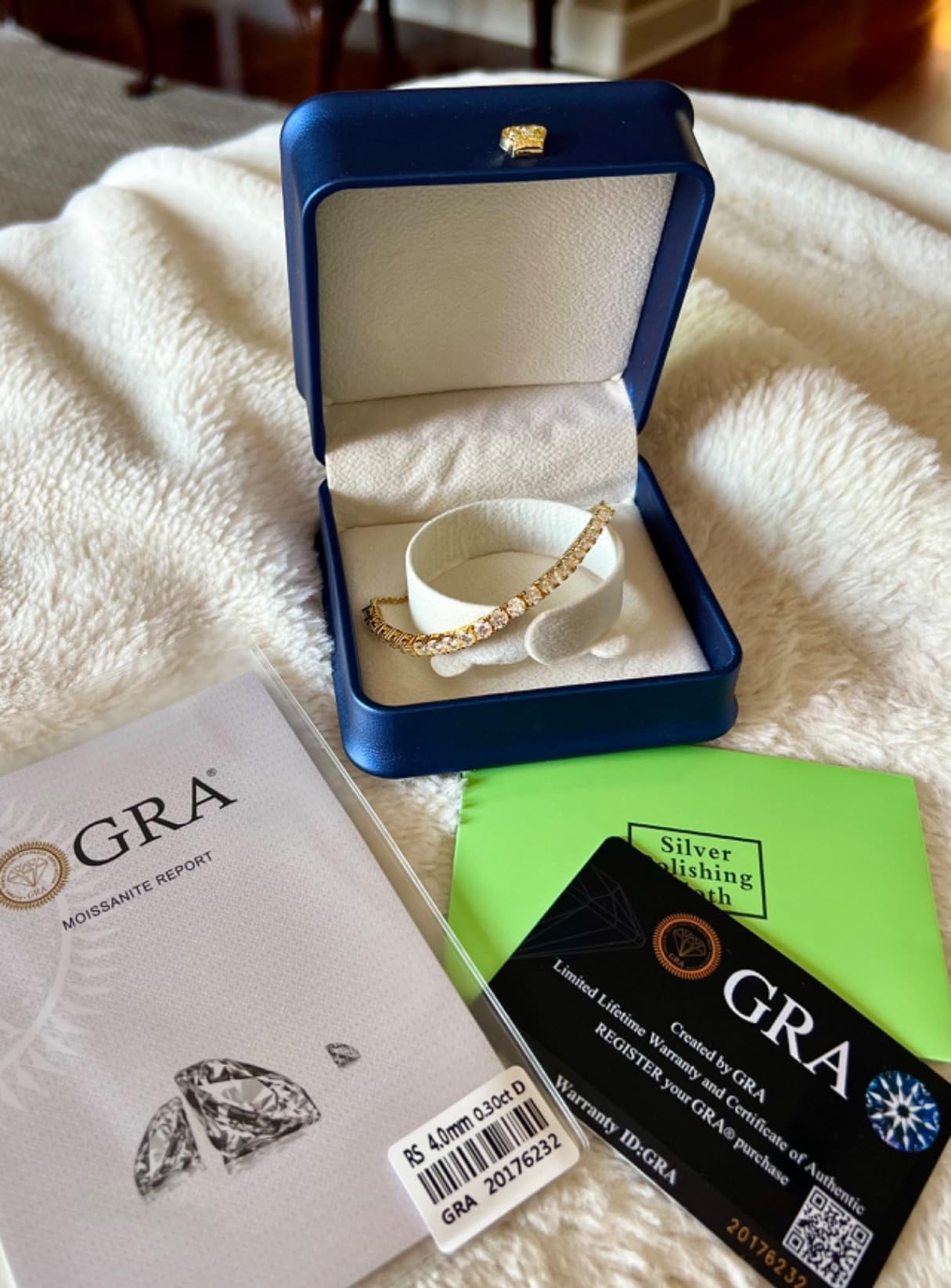 Each of our pieces comes with a unique GRA certification, detailing the characteristics of the moissanite stones, including weight, carat size, color grade, clarity, and more.